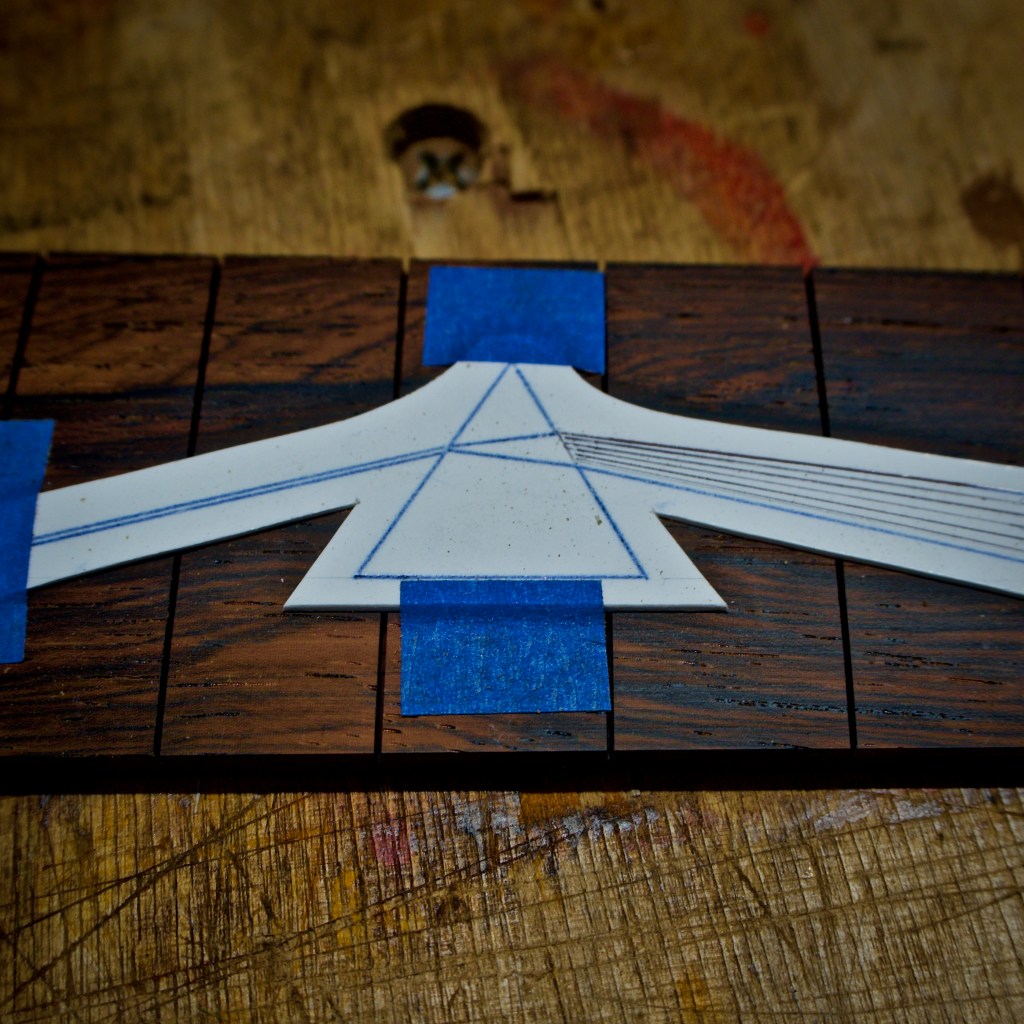 GC: (Roger shows me a beautifully figured Brazilian rosewood fingerboard with a paper rendering of the instantly recognizable prism from Pink Floyd’s Dark Side of the Moon album cover taped to it.)
